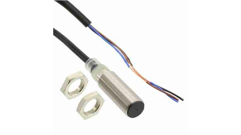 Sensore di prossimità cilindrico induttivo Omron E2B, PNP normalmente chiuso, M12 x 1, rilevamento 4 mm, tensione di alimentazione 10-30 V c.c., cavo precablato di 5 m, temperatura d'esercizio da -25 a 70 gradi Celsius, grado di protezione IP67, corpo in nichel-ottone, lunghezza 47 mm, indicatore visibile 360 gradi.