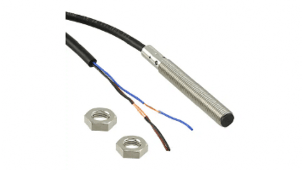 Sensore di prossimità cilindrico Omron, induttivo, 3 fili, corpo in acciaio inox, dimensione M8 x 1, uscita PNP, distanza di rilevamento 2 mm, configurazione normalmente aperti, cavo in PVC da 5 m.