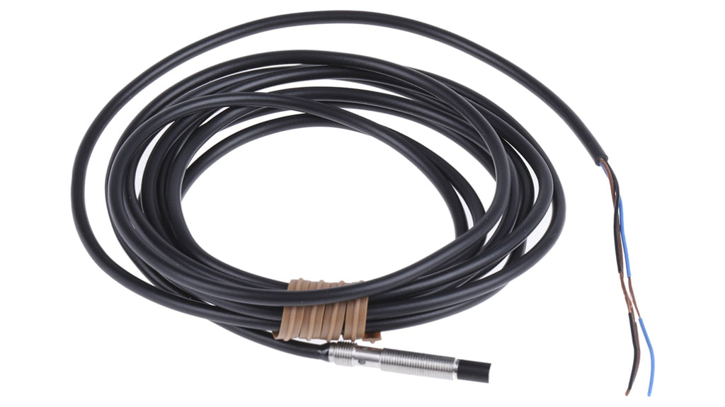 Sensore di prossimità induttivo cilindrico, diametro 5 mm, uscita NPN, rilevamento a 3 mm, tensione di alimentazione 10-30 V c.c., corrente di commutazione 100 mA, frequenza di commutazione massima 2 kHz, grado di protezione IP67, materiale custodia acciaio inox, temperatura operativa da -25 a +70 gradi Celsius, installazione non a filo, protezione da inversione di polarità e cortocircuito. Codice costruttore E2E-S05N03-WC-C1 2M, marchio Omron.