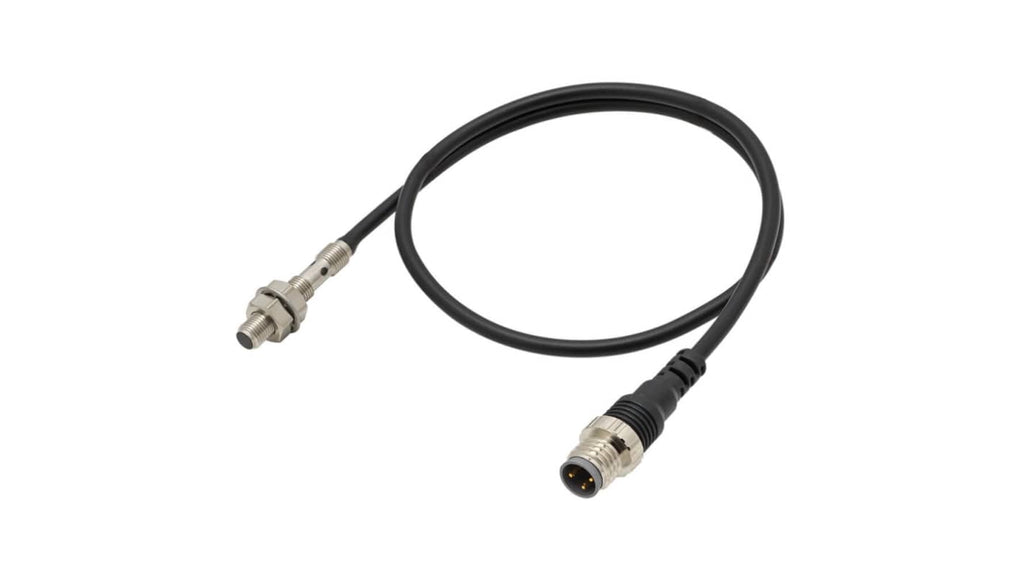 Sensore di prossimità induttivo cilindrico, PNP, M5 x 0.5, rilevamento 1,2 mm, tensione di alimentazione 10-30 V c.c., grado di protezione IP67, connettore M8 a 3 pin, lunghezza 25 mm, frequenza di risposta max 5 kHz, installazione semplificata, disponibile in varianti con tubo a spirale protettivo in acciaio inox. Codice costruttore E2E-S05S12-CJ-B1 0.3M, marchio Omron.