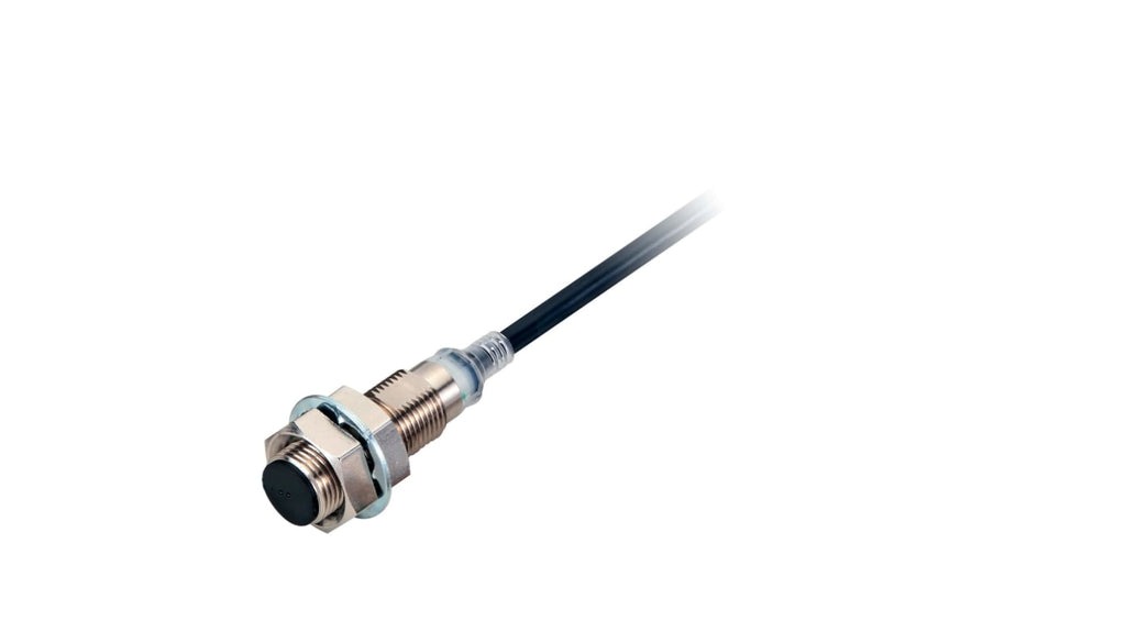 Sensore di prossimità cilindrico, tecnologia induttiva, M12 x 1, uscita NPN e PNP, gamma di rilevamento 9 mm, grado di protezione IP67G, cavi con resistenza all'olio potenziata, certificazione UL60947-5-2, LED ad alta luminosità visibile a 360 gradi. Codice costruttore E2E-X7D212 2M, marchio Omron.