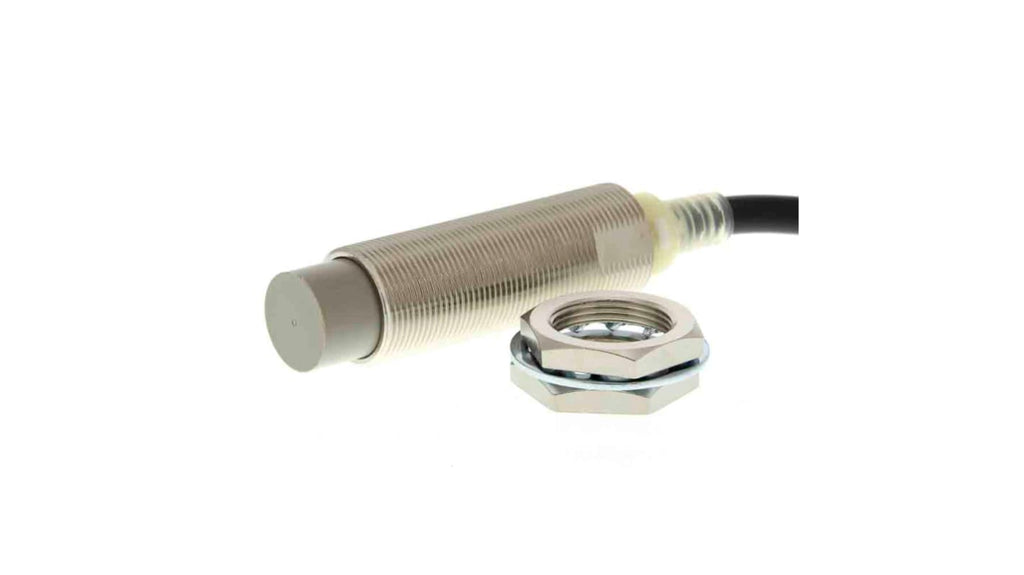 Sensore di prossimità cilindrico induttivo. Dimensione filetto M18 x 1, gamma di rilevamento 10 mm, tensione di alimentazione 24 a 240 V c.a., grado di protezione IP67, tipo terminale precablato. Maggiore resistenza di serraggio, sezione fresata per impugnatura chiave, indicatore con maggiore visibilità. Codice costruttore E2E2-X10MY1 2M, marchio Omron.
