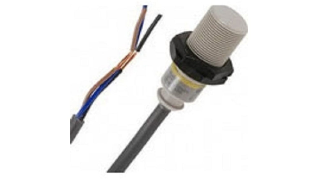Sensore di prossimità induttivo cilindrico Omron, corpo in plastica, M18 x 1, uscita NO, distanza di rilevamento 5 mm, tensione di alimentazione 12-24 V, grado di protezione IP68, temperatura d'esercizio -25 a 70 gradi Celsius. Codice costruttore E2F-X5Y1 2M.