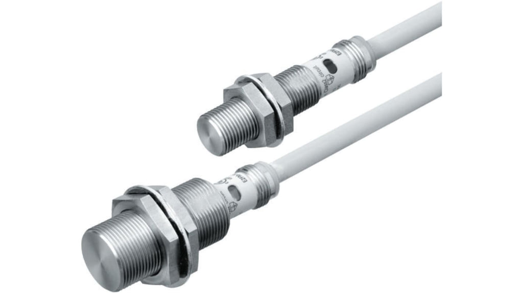 Sensore di prossimità cilindrico induttivo, PNP, M18 x 1, rilevamento 5 mm, tensione di alimentazione da 12 a 24 V c.c., corrente di commutazione 200 mA, connettore M12 a 4 pin, grado di protezione IP67, temperatura operativa da -25 a +70 gradi Celsius, alloggiamento in acciaio inox, schermato, protezione da sovraccarico e corto circuito, frequenza di commutazione massima 100 Hz. Codice costruttore E2FM-X5B1-M1, marchio Omron.