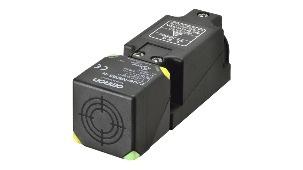 Sensore di prossimità induttivo rettangolare, NPN, gamma di rilevamento 20 mm, tensione di alimentazione 10-30 V c.c., grado di protezione IP67, corrente di commutazione 20 mA, temperatura operativa da -25 a +70 gradi, materiale custodia poliammide, montaggio a filo, tubo protettivo M20, schermato, frequenza di commutazione massima 150 Hz, conforme a standard CE e UL. Codice costruttore E2Q6N20E3H, marchio Omron.