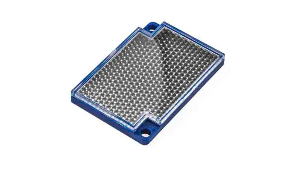 Riflettore per sensore di rilevamento oggetti trasparenti, tipo a resistenza detergente, montaggio superficiale a vite, contenitore in PVC, grado di protezione IP69K, robusto e facilmente regolabile. Compatibile con sensore serie E3ZM-B, serie E39.