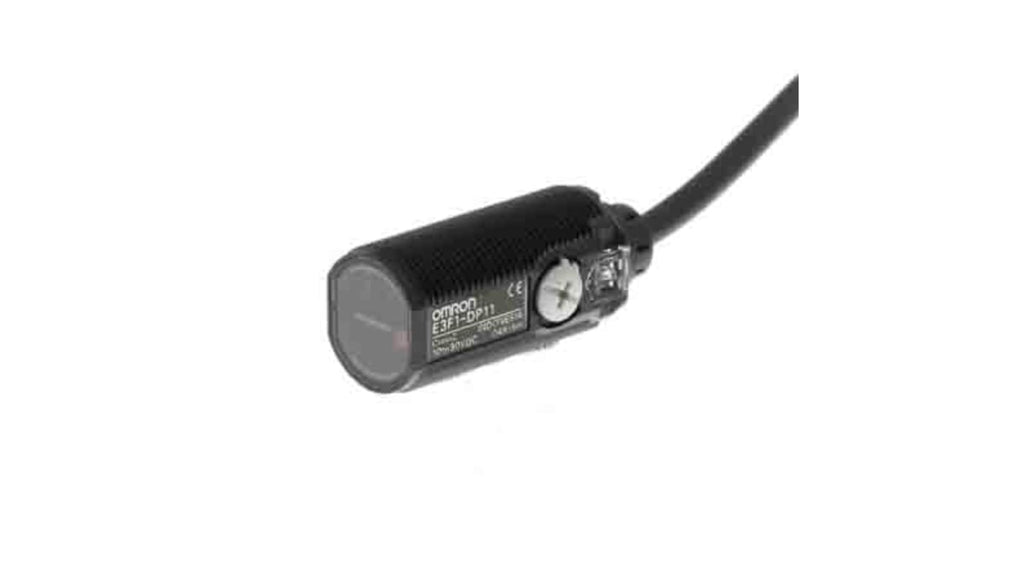 Sensore fotoelettrico a diffusione, miniaturizzato filettato, rilevamento fino a 100 mm, uscita NPN, precablato con cavo da 2 m. Corpo in plastica, contenitore compatto e robusto per integrazione nelle macchine, LED rosso per facile allineamento, funzionamento affidabile in ambienti industriali. Serie E3F1.