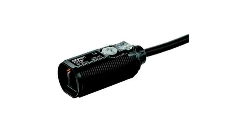 Sensore fotoelettrico cilindrico a diffusione, rilevamento 300 mm, uscita PNP, pre-cablato con cavo da 5 m, serie E3FA. Corpo in plastica, alta protezione EMC, elevata immunità alla luce, robusto e impermeabile. Facile installazione e configurazione, indicatore LED rosso per allineamento visibile da lunghe distanze.