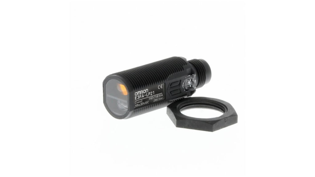 Sensore fotoelettrico cilindrico a soppressione di sfondo, rilevamento 100 mm, uscita PNP, connettore M12. Compatibile con la serie E3F2, facile da installare grazie al formato compatto. Marchio Omron, codice costruttore E3FA-LP21-F2.
