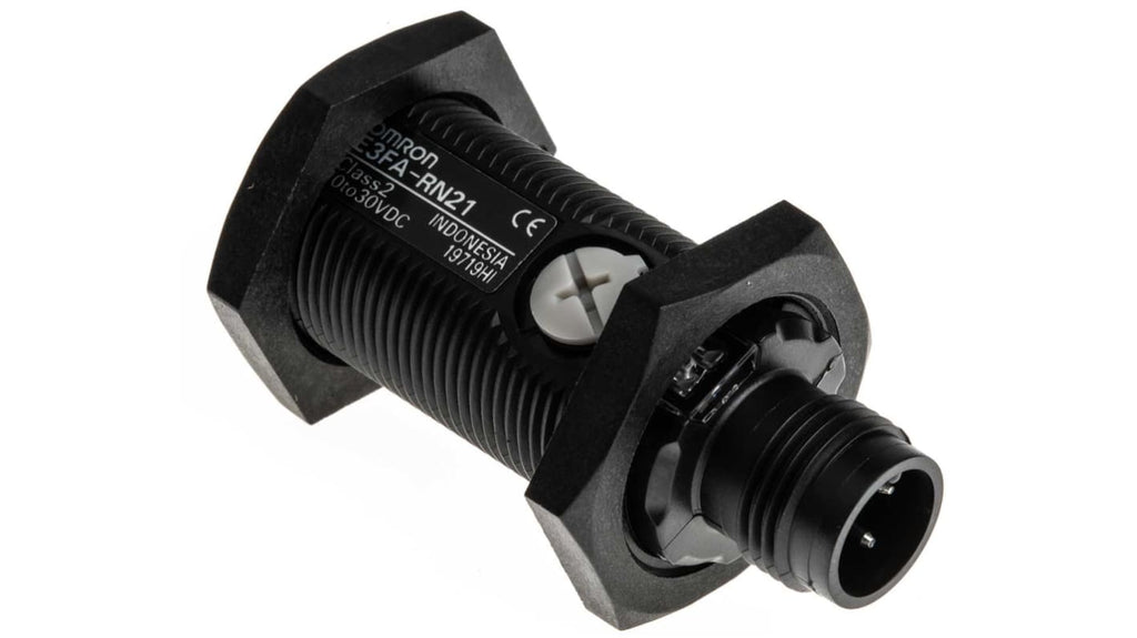 Sensore fotoelettrico cilindrico a retroriflessione, gamma di rilevamento 100 mm a 4 m, uscita NPN, con connettore a 4 pin M12. Tensione massima 30V, corrente massima 25 mA, tempo di risposta 500 μs. Grado di protezione IP67 e IP69K, temperatura operativa da -25°C a +55°C. Custodia in ABS, design compatto, amplificatore integrato, protezione contro cortocircuiti e inversione di polarità. Modello E3FA-RN21, marchio Omron.