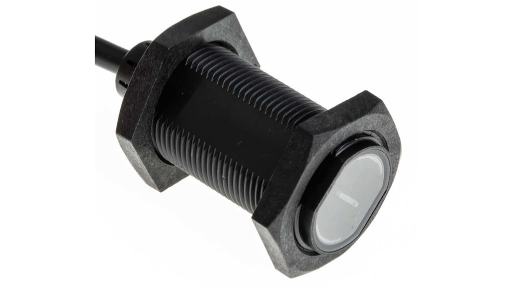 Sensore fotoelettrico cilindrico a diffusione, rilevamento 100 mm, uscita NPN, design compatto, alloggiamento in plastica ABS, luce LED visibile per allineamento, indicazione LED, configurazione Luce-ON/Buio-ON, protezione contro inversione di polarità e cortocircuiti, tensione massima 30V, corrente massima 25 mA, tempo di risposta 500 μs, grado di protezione IP67/IP69K, temperatura operativa da -25 a +55 gradi.