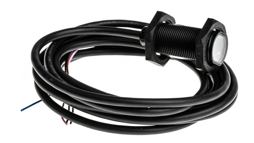 Sensore fotoelettrico cilindrico a retroriflessione, rilevamento da 100 mm a 4 m, uscita PNP, tensione massima 30 V c.c., corrente massima 100 mA, tempo di risposta 0,5 ms, temperatura operativa da -25 °C a +55 °C, grado di protezione IP67 e IP69K, alloggiamento in plastica ABS, modalità di commutazione selezionabile Light ON/Dark ON, cavo a 4 fili da 2 m, conforme a standard CE.