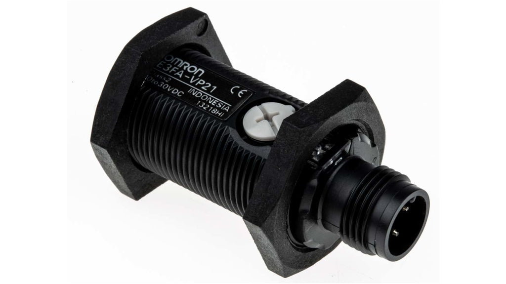 Sensore fotoelettrico cilindrico a diffusione, rilevamento da 10 mm a 50 mm, uscita PNP, con connettore a 4 pin M12. Design compatto in plastica ABS, grado di protezione IP67 e IP69K. Tensione massima 30V, corrente massima 25 mA, tempo di risposta 500 μs. Temperatura operativa da -25°C a +55°C. Amplificatore integrato, protezione contro cortocircuiti e inversione di polarità. Modello E3FAVP21, marchio Omron.