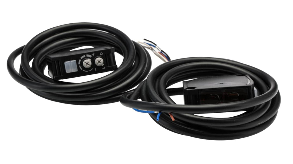 Sensore fotoelettrico a fascio diretto, rilevamento fino a 40 m, uscita a relè, alimentatore incorporato, LED rosso per facile allineamento, grado di protezione IP64, tempo di risposta 20 ms, temperatura operativa da -25 a +55 gradi Celsius, custodia in ABS, cavo a 5 fili da 2 m, massima tensione c.a. e c.c. 240V, serie E3JK.