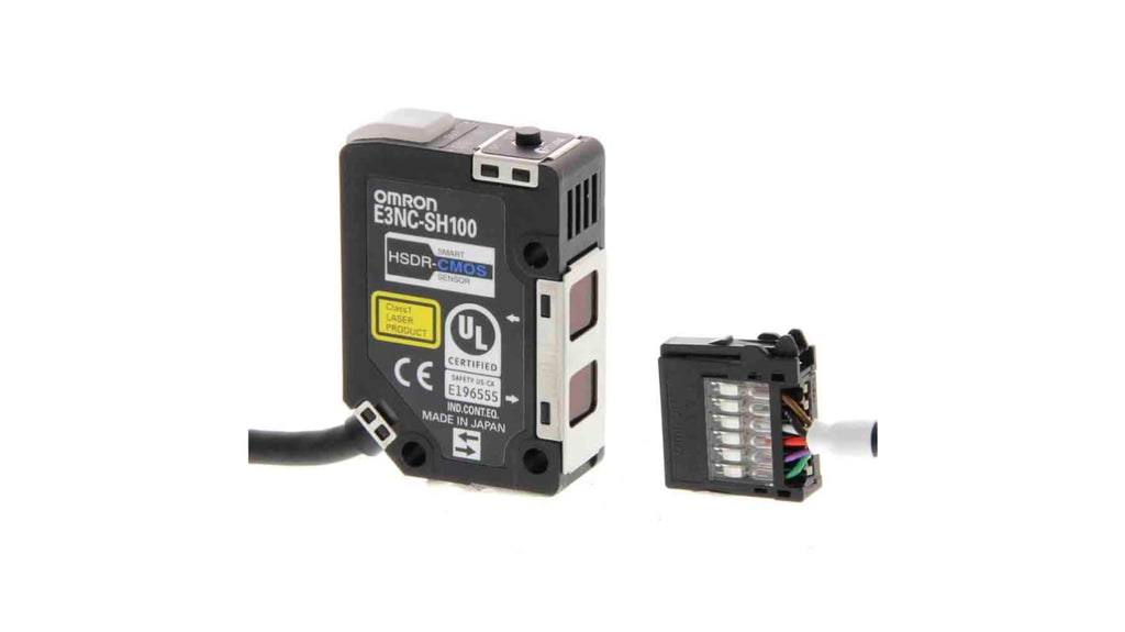 Sensore laser intelligente per applicazioni industriali, modello E3NC-SH100 2M, marchio Omron. Rilevamento stabile con sintonizzazione intelligente, facile configurazione. Gamma di rilevamento: 35 mm a 100 mm. Progettato per sostituire sensori a fibre ottiche e fotoelettrici.