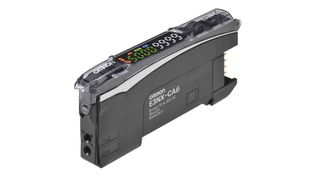 Amplificatore fibra ottica Omron, NPN, tensione di alimentazione da 10 a 30 V, rilevamento di sottili differenze di colore, gestione di pezzi lucidi, compatibile con IoT. Modello E3NX-CA6.