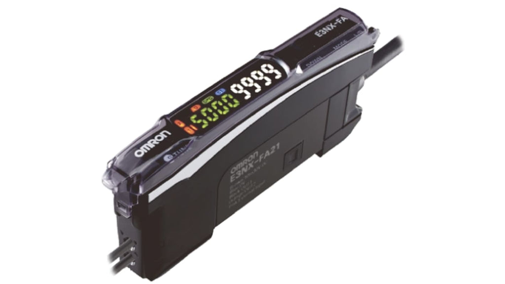 Sensore per fibre ottiche con uscita PNP, tensione di alimentazione 10-30 V c.c., unità amplificatore E3NX-FA, display in bianco e nero ad alta visibilità, tempo di risposta 1 ms in modalità standard, sorgente di luce LED rosso, connettore salvafili, consumo energetico 1,08 W, custodia in PC, dimensioni 104,8 x 27,8 x 10 mm, temperatura operativa da -25 a +55 gradi Celsius.