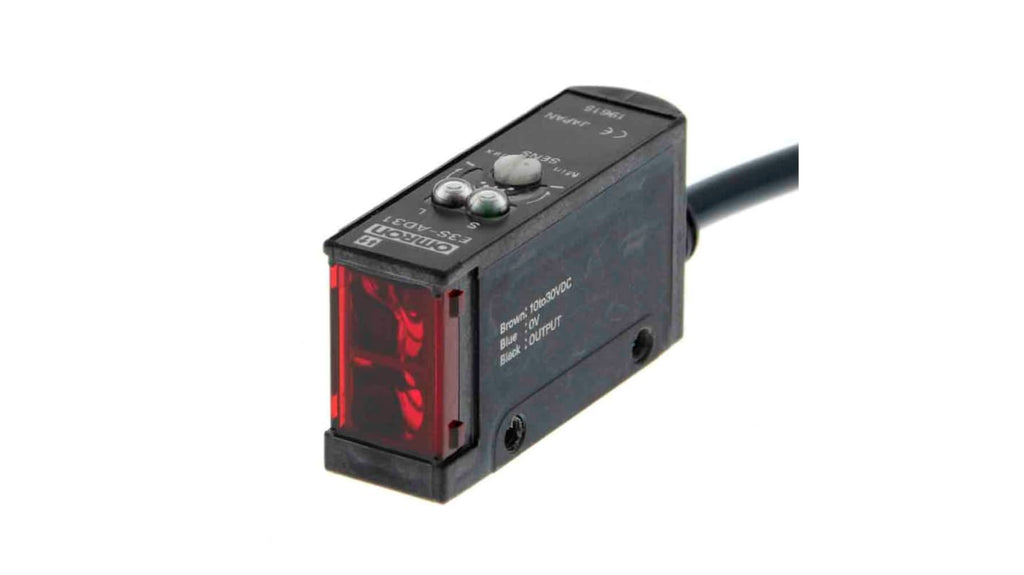 Sensore fotoelettrico a riflessione diffusa, modello E3S-AD33, marchio Omron. Rilevamento a 100 mm, uscita PNP, collegamento elettrico con cavo precablato. Stile orizzontale, progettato per applicazioni industriali.