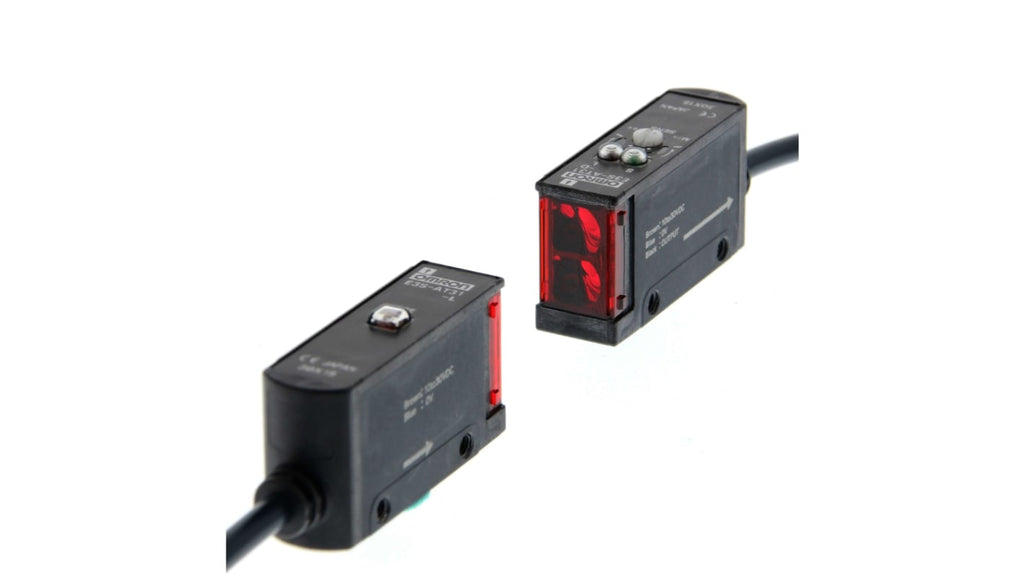 Sensore fotoelettrico a fascio passante, rilevamento fino a 7000 mm, uscita PNP, alimentatore incorporato, compatibile con alimentatori c.a./c.c., LED rosso per visibilità del punto, indicatori grandi visibili da lontano, modalità di commutazione luce/buio, collegamento elettrico tramite cavo. Modello E3S-AT31, marchio Omron.