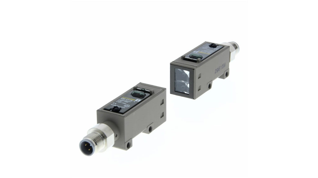 Sensore fotoelettrico rettangolare a fascio diretto, rilevamento fino a 30 m, uscita NPN/PNP, collegamento elettrico a innesto a 3 fili M12. Struttura compatta in metallo, resistente all'olio, grado di protezione IP67, resistenza agli urti fino a 1000 m/s2. Serie E3S-C, applicabile in ambienti industriali e linee di produzione.