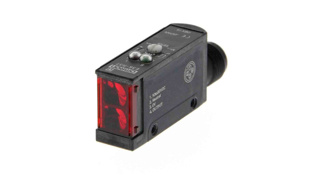 Sensore fotoelettrico a riflessione retroriflettente, Omron E3S-R37, rilevamento di oggetti trasparenti, gamma di rilevamento 100 mm a 300 mm, uscita PNP, connettore M12, grado di protezione IP67. Utilizzato per il rilevamento di wafer di vetro e schede a circuito stampato in vetro LCD.