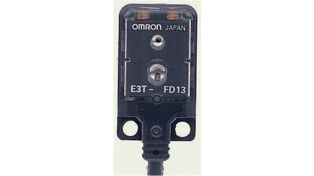 Sensore fotoelettrico rettangolare a diffusione, rilevamento da 5 a 30 mm, uscita PNP, alimentazione in corrente continua, modalità di commutazione luce/buio, contenitore in plastica, spessore 3,5 mm, grado di protezione IP67, lente di ricezione della luce esclusiva, massima ripetibilità per oggetti di colori diversi, sincronizzazione di impulsi. Modello E3T-FD14 2M, marchio Omron.