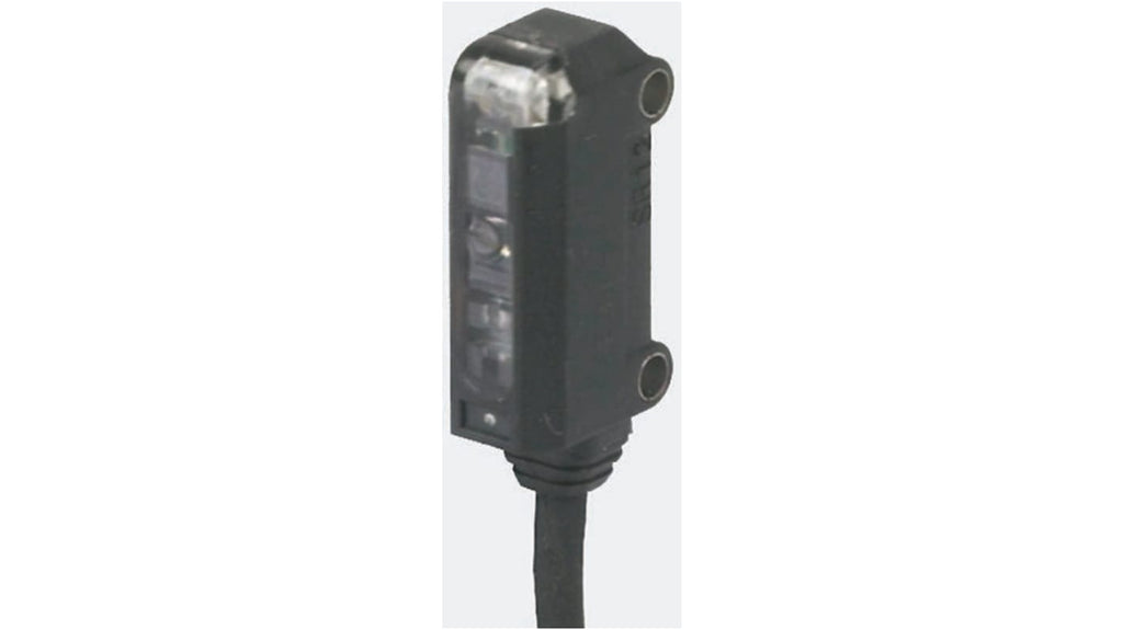 Sensore fotoelettrico rettangolare a retroriflessione, rilevamento da 5 mm a 15 mm, uscita NPN, precablato con cavo di 2 m. Grado di protezione IP67, temperatura operativa da -25°C a +55°C, corrente massima 50 mA, tempo di risposta 1 ms. Custodia in PBT, sorgente di luce LED, serie E3T. Spot ottico visibile per facile regolazione, soppressione parziale di sfondo.