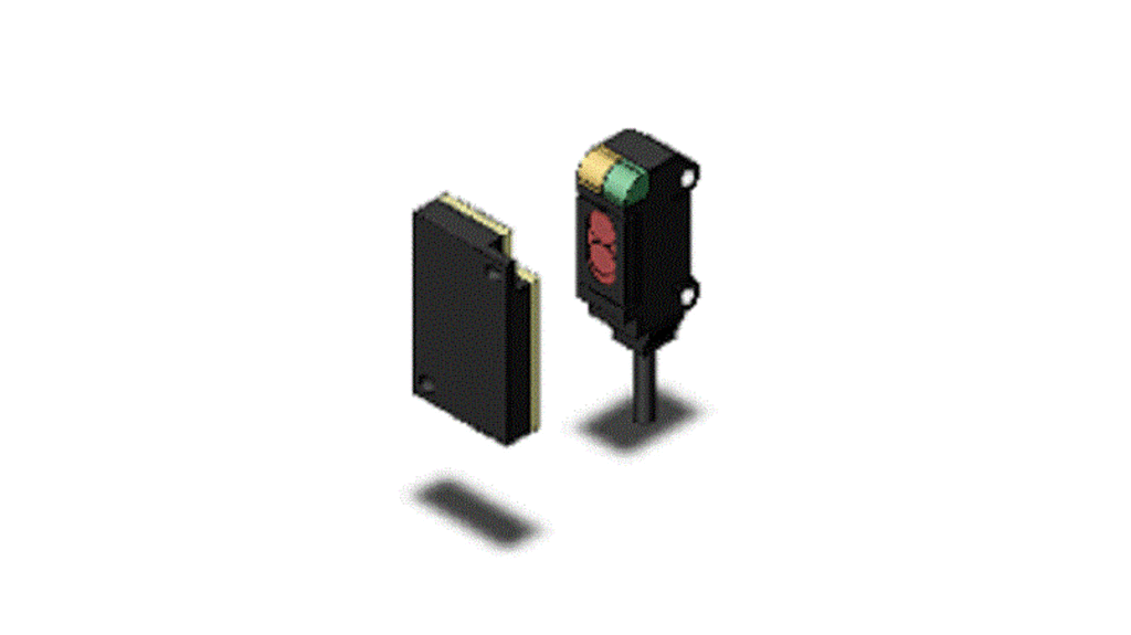 Sensore fotoelettrico a retroriflessione, rilevamento 200 mm, uscita PNP, alimentatore incorporato, supporta alimentatori c.a./c.c., lunga distanza di rilevamento fino a 8 volte rispetto ai modelli convenzionali, LED rosso visibile, indicatori grandi visibili da lontano. Modello E3T-SR43 2M, marchio Omron.