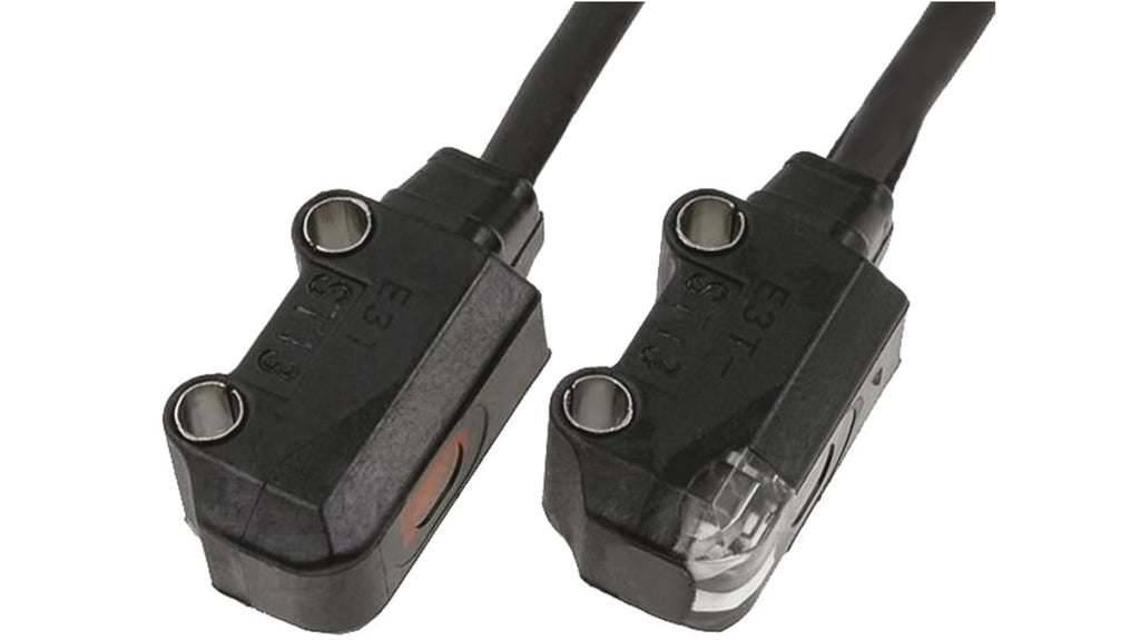 Sensore fotoelettrico a fascio diretto, serie E3T, rilevamento fino a 1 m, uscita PNP, tensione massima 26.4V, corrente massima 50 mA, tempo di risposta 1 ms, temperatura operativa da -25°C a +55°C, grado di protezione IP67, custodia in PBT, montaggio precablato, spot ottico visibile per regolazione semplice.