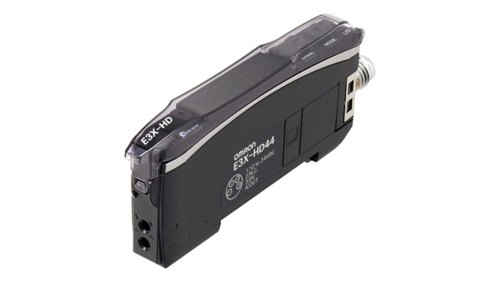 Sensore per fibre ottiche con amplificatore NPN, connettore M8 a 4 pin, modalità di funzionamento Dark-ON e Light-ON, tensione di alimentazione 12-24 V, tempo di risposta 0,0001 secondi, consumo energetico 720 mW, grado di protezione IP50, forma cuboide per montaggio su guida. Codice costruttore E3X-HD14, marchio Omron.