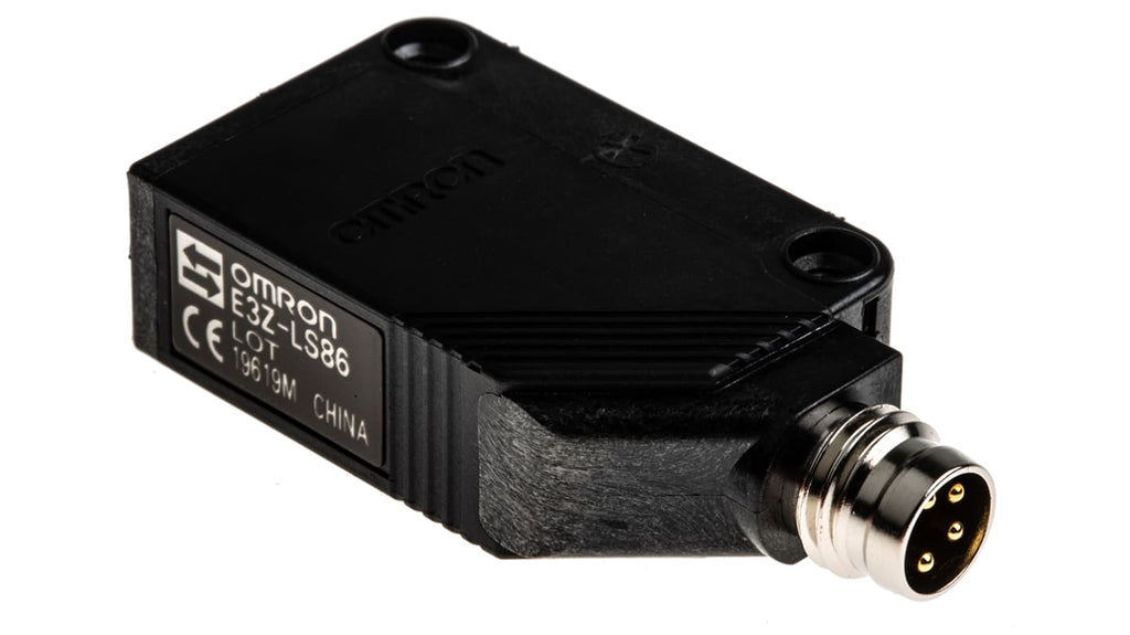 Sensore di distanza rettangolare fotoelettrico, rilevamento da 20 mm a 200 mm, uscita PNP, tensione massima 26,4 V c.c., corrente massima 100 mA, tempo di risposta 1 ms, grado di protezione IP67, montaggio a flangia, custodia in PBT, connettore a 4 pin M8, temperatura operativa da -25°C a +55°C, modalità di commutazione luce/buio, serie E3Z, conforme a standard CE.