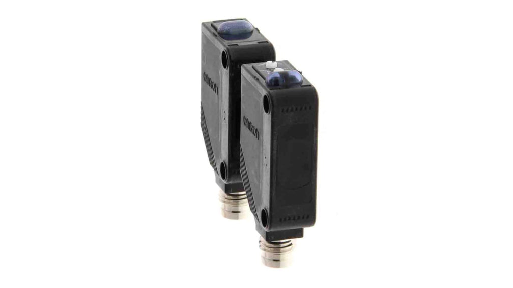 Sensore fotoelettrico a fascio diretto, rilevamento fino a 30 m, uscita PNP, amplificatore incorporato, grado di protezione IP67 e IP69K, connettore M8. Serie E3Z, design rettangolare, facile da installare e affidabile.