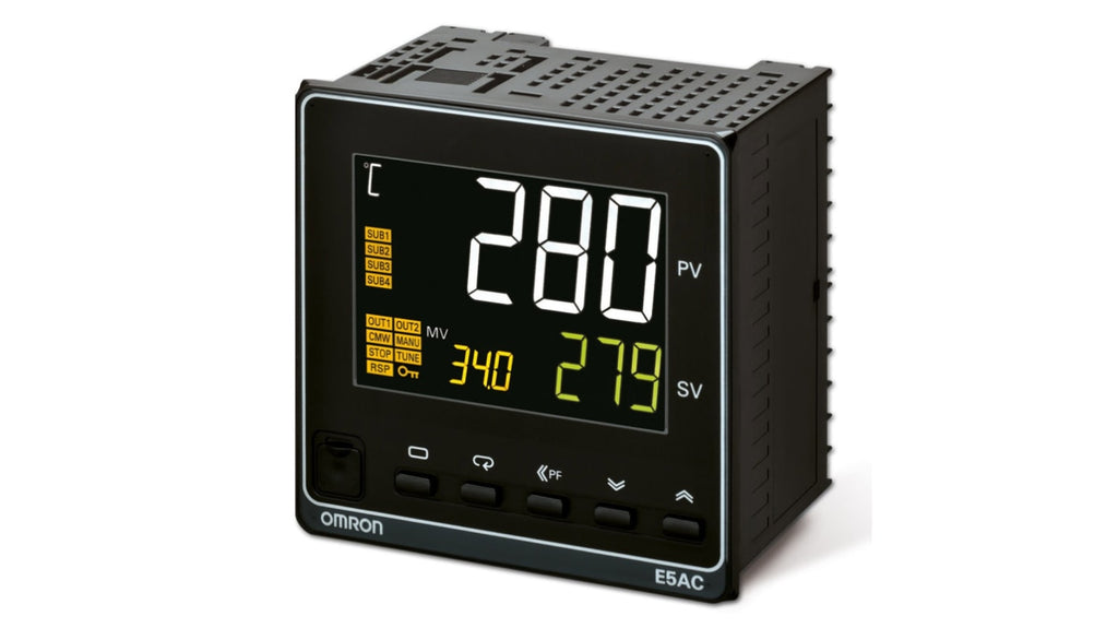 Termoregolatore PID Omron, tensione di alimentazione 100-240 V c.a., dimensioni 96 x 96 mm, uscita a relè proporzionale alla posizione, 4 uscite, 2 ingressi, tipo di controllo ON/OFF, PID, controllore 2-PID, tipo di ingresso termometro universale a resistenza al platino PT100, termocoppia, analogico, montaggio a pannello, morsettiera a vite. Campionatura ad alta velocità a 50 ms, corpo compatto, ampio display PV bianco.