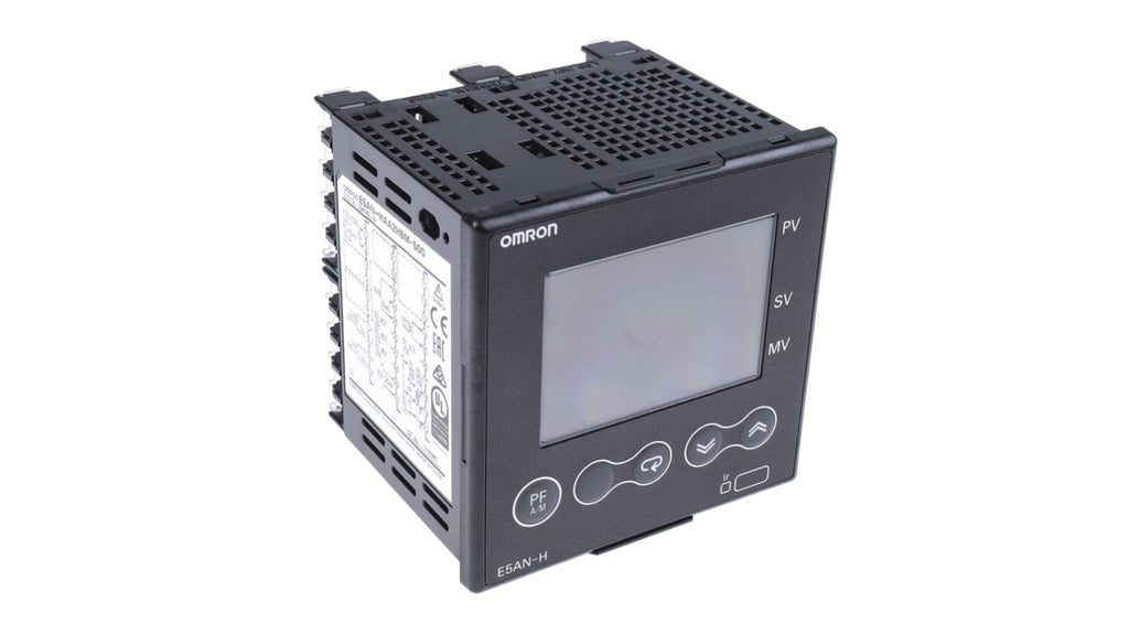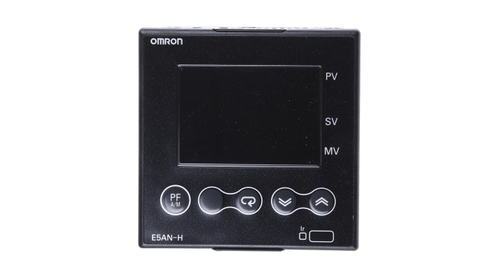 Termoregolatore PID Omron E5AN, alimentazione 100-240 V c.a., dimensioni 96 x 96 mm, due uscite relè ausiliario, ingresso universale per termocoppie e PT100, controllo ON/OFF e PID, ciclo di campionamento 60 ms, display ad alta risoluzione 5 cifre, operatività da -10 a +55 gradi Celsius, montaggio a pannello, morsettiera a vite, certificazioni CSA, UL, EN 61010-1.