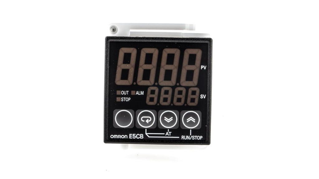 Termoregolatore Omron E5CB, uscita relè 250VAC 3A, uscita allarme 250VAC 1A, alimentazione 100-240VAC, dimensioni 48x48mm, profondità 60mm, tipo di controllo ON/OFF, PID, ingresso PT100, display LED rosso/verde, grado di protezione IP66 frontale, IP20 posteriore, certificazioni CSA, EN61010-1, UL 61010-1, configurazione semplice con meno di 20 parametri. Montaggio a pannello, morsettiera a vite.