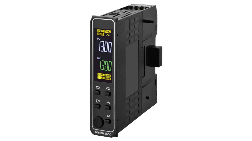 Termoregolatore PID Omron E5DC, tensione di alimentazione 24 V c.a./c.c., dimensione 22.5 mm, 0 uscite, tipo uscita SSR, relè a stato solido, logica, campionatura ad alta velocità a 50 ms, corpo compatto, pannello di controllo innovativo, montaggio su guida DIN o a pannello, ingresso per termometro universale a resistenza al platino, PT100, termocoppia, analogico, configurazione senza alimentazione tramite collegamento a computer.