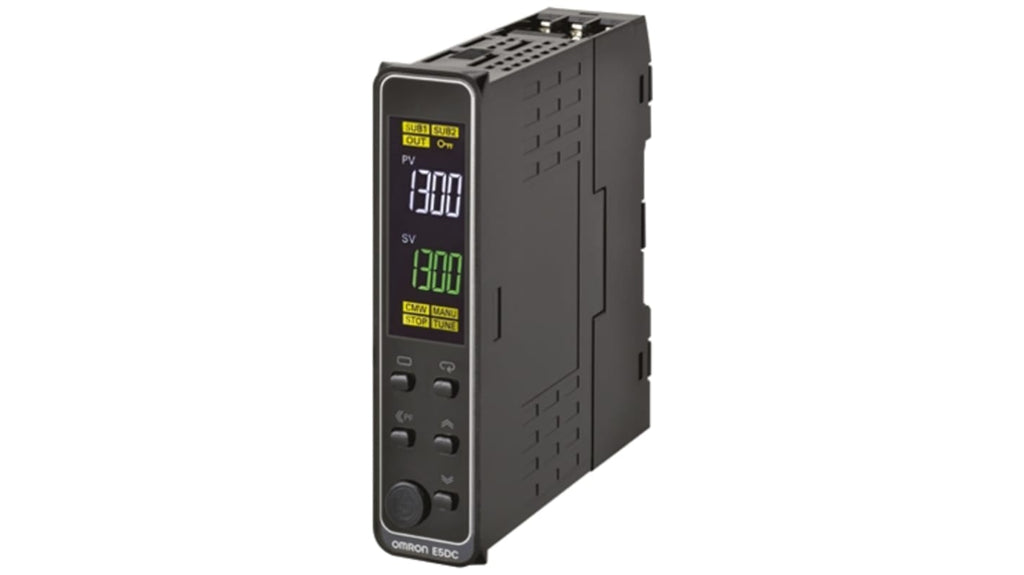 Termoregolatore PID Omron E5DC, alimentazione 100-240 V c.a., larghezza 22,5 mm, 2 uscite SSR, relè a stato solido, logica. Tempo di campionamento 50 ms, configurazione semplice con CX-Thermo, display LCD bianco. Gamma di temperatura da -200 a +2300 °C, montaggio su guida DIN, morsettiera rimovibile, grado di protezione IP00/IP20. Tipo di ingresso: termocoppia, PT100, analogico. Profondità pannello 85 mm.