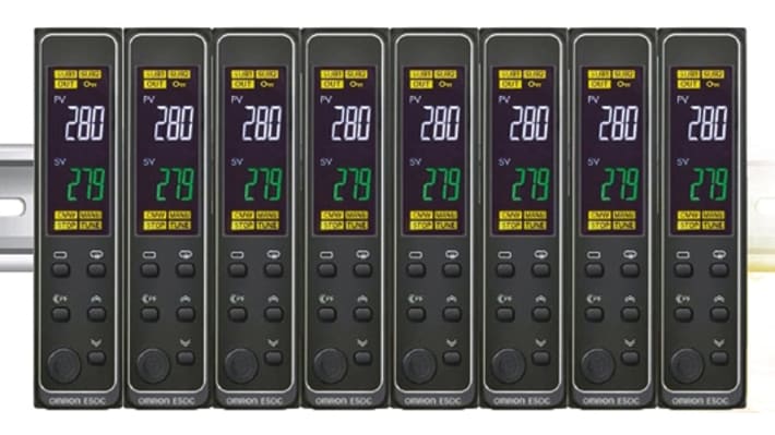 Termoregolatore PID Omron E5DC, 24 V ca/cc, 22,5 mm, 2 uscite SSR, relè a stato solido, logica. Tempo di campionamento 50 ms, configurazione semplice con CX-Thermo, display digitale a 11 segmenti, grado di protezione IP00/IP20, montaggio su guida DIN, morsettiera a vite. Gamma di temperatura da -200 a +2300 °C, minima temperatura operativa -10 °C, massima temperatura operativa +50 °C. Profondità pannello 85 mm.