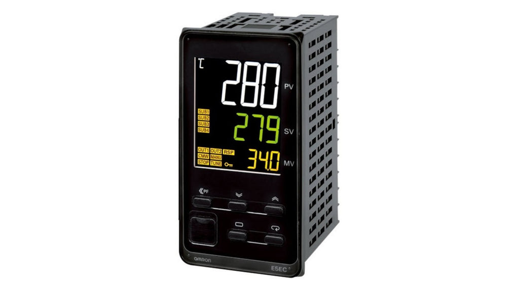 Termoregolatore PID Omron E5EC, tensione di alimentazione 100-240 V c.a., dimensioni 96 x 48 mm, 4 uscite SSR, relè a stato solido, logica, 3 ingressi, tipo di controllo ON/OFF, PID, controllore 2-PID, tipo di ingresso termometro universale a resistenza al platino PT100, termocoppia, analogico, montaggio a pannello, morsettiera a vite. Campionatura ad alta velocità a 50 ms, corpo compatto, ampio display PV bianco.