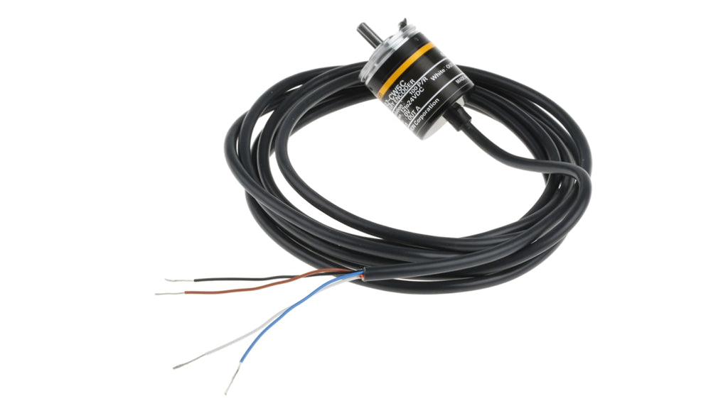 Encoder rotativi incrementali Omron, tecnologia incrementale, 100 impulsi per giro, uscita collettore aperto NPN, diametro albero 4 mm, tensione di alimentazione 12-24 V c.c., grado di protezione IP50, altezza complessiva 46.5 mm, larghezza complessiva 22 mm, temperatura operativa -10 a +55 gradi Celsius, frequenza di commutazione 30 kHz, momento di inerzia 1x10^-6 kg·m2 max.