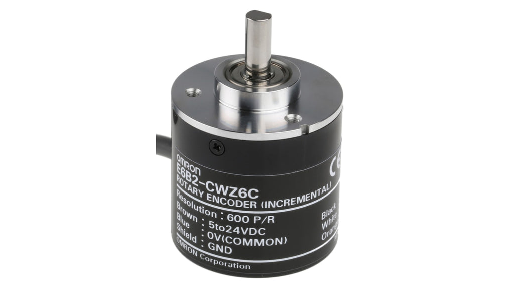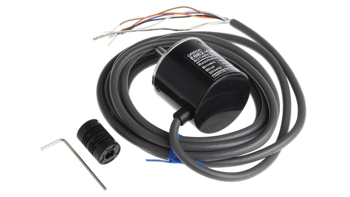Encoder rotativi incrementali Omron, 600 impulsi per giro, uscita collettore aperto NPN, diametro albero 6 mm, tensione di alimentazione 5-24 V c.c., grado di protezione IP50, altezza complessiva 59 mm, frequenza di commutazione 100 kHz, momento di inerzia massimo 1x10^-6 kg·m2, rotazione massima 6000 giri/min. Prodotto per impieghi generici.