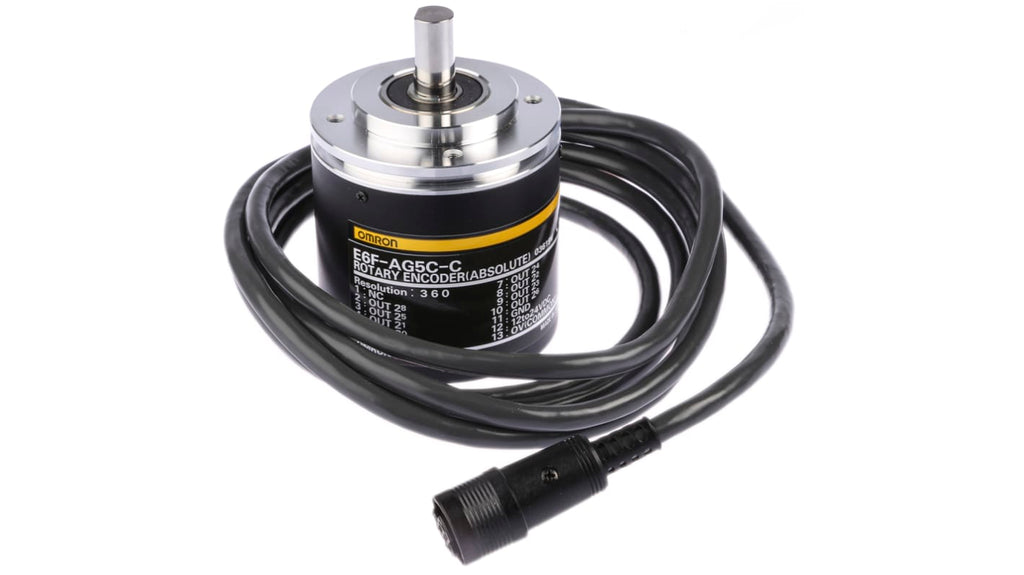 Encoder assoluto Omron, 360 impulsi per giro, diametro albero 10 mm, uscita collettore aperto NPN. Tensione di alimentazione 12-24 V c.c., risoluzione 10 bit, grado di protezione IP65. Rotazione massima 5000 giri/min, frequenza di commutazione 20 kHz, temperatura operativa da -10 a +70 gradi Celsius. Dimensioni: altezza 85 mm, larghezza 60 mm. Modello E6F-AG5C-C 360 2M.