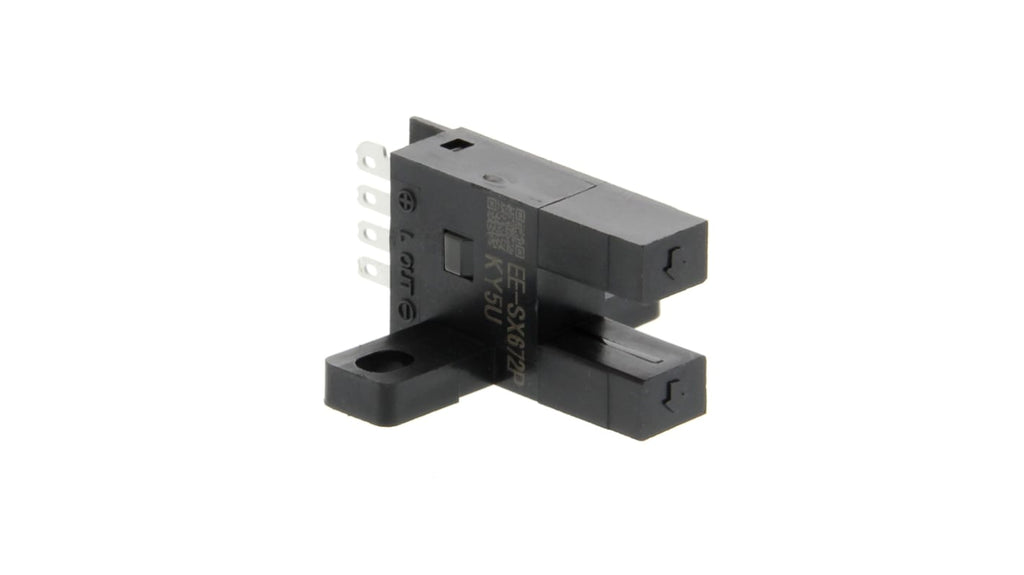 Sensore fotoelettrico a fascio diretto, rilevamento fino a 5 mm, uscita PNP, grado di protezione IP50. Collegamento elettrico tramite connettore del sistema, tipo terminale e connettore compatibili. Serie EE-SX. Prodotto da Omron, codice costruttore EE-SX672R.