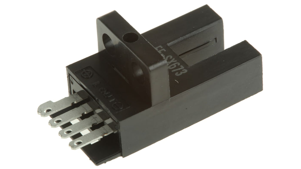 Sensore fotoelettrico a forcella, tipo di rilevamento a fascio diretto, gamma di rilevamento 5 mm, uscita NPN, tensione massima 24V, corrente massima 100 mA, sorgente di luce infrarossi, grado di protezione IP50, temperatura operativa da -25°C a +55°C, custodia in PBT, connettore per collegamento elettrico. Marchio Omron, codice costruttore EE-SX673.