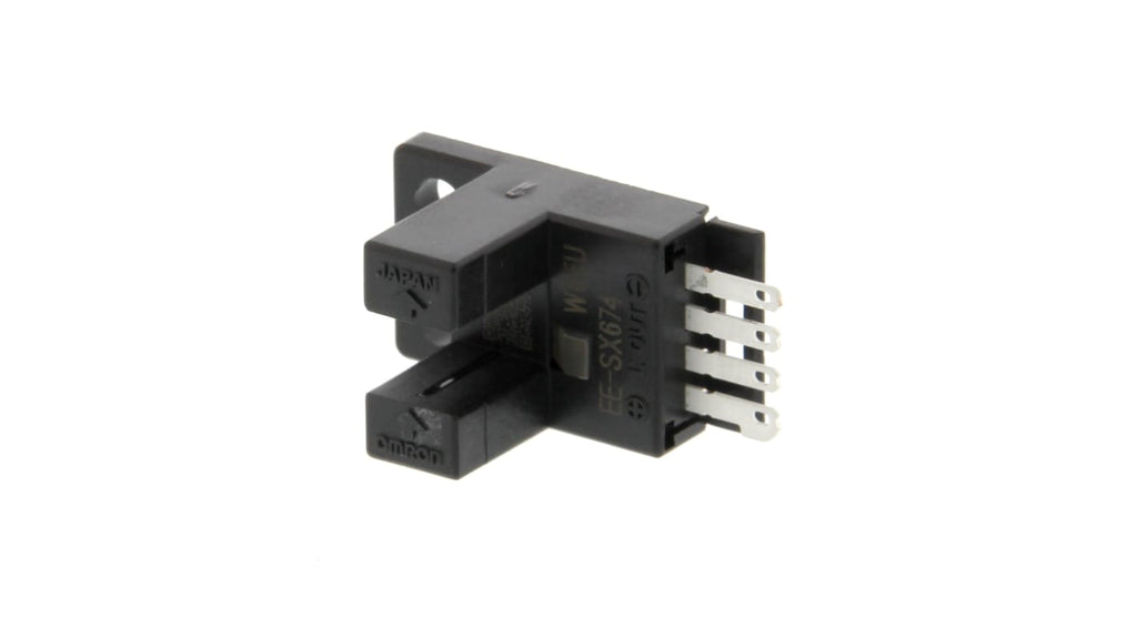 Sensore fotoelettrico a fascio diretto, rilevamento a fessura, gamma di rilevamento 5 mm, uscita PNP, montaggio ravvicinato, commutazione dark-ON e light-ON, serie EE. Marchio Omron, codice costruttore EE-SX674R.