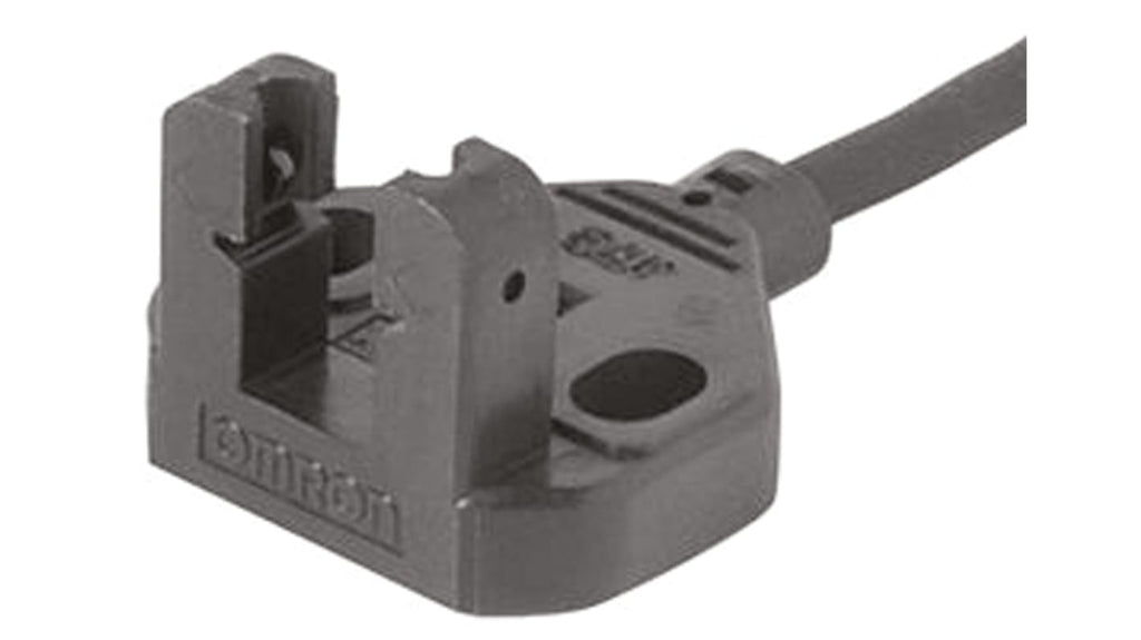 Sensore fotoelettrico con uscita NPN, modello EE-SX771, marchio Omron. Ampia gamma di tensione di alimentazione da 5 a 24 V c.c., temperatura d'esercizio da -25 a +55 C, grado di protezione IP60. Cavo precablato da 2 metri, larghezza scanalatura 5 mm. Sorgente di luce LED a infrarossi GaAs, custodia in polibutilene ftalato. Basso consumo di corrente.