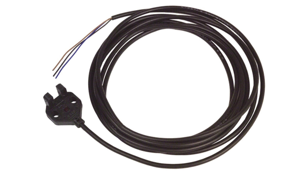 Sensore fotoelettrico con uscita NPN, modello EE-SX871, marchio Omron. Ampia gamma di tensione di alimentazione da 5 a 24 V c.c., basso consumo di corrente, temperatura d'esercizio da -25 a 55 gradi Celsius. Grado di protezione IP60, custodia in polibutilene ftalato, cavo precablato da 2 metri. Sorgente di luce: LED a infrarossi GaAs. Larghezza scanalatura 5 mm.