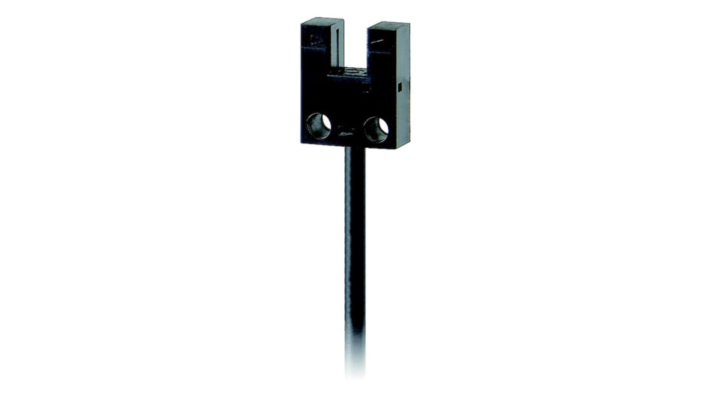 Sensore fotoelettrico a forcella, rilevamento 5 mm, uscita PNP, montaggio con viti M3, indicazione della finestra di rilevamento, indicatore luminoso per conferma da molte direzioni, uscite luce-ON e buio-ON, circuito di protezione contro cortocircuiti di carico, alimentazione CC. Codice costruttore EE-SX954P-R 1M, marchio Omron.