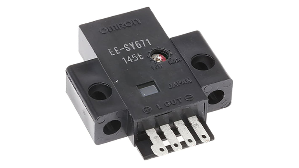 Sensore fotoelettrico a riflessione diffusa, rilevamento da 1 mm a 5 mm, uscita NPN, tensione massima 24V, corrente massima 100 mA, sorgente di luce infrarossa, grado di protezione IP50, temperatura operativa da -25°C a +55°C, contenitore in plastica nera, indicazione LED. Connettori compatibili per installazioni specifiche. Codice costruttore EE-SY671, marchio Omron.