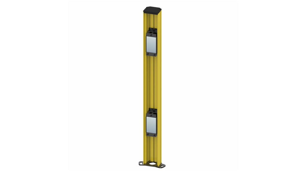 Colonna a specchio per sensore di sicurezza multiraggio. Altezza 1310 mm, struttura in lega di alluminio, base in acciaio laminato a caldo, cappuccio in resina PBT, specchio in vetro. Compatibile con F3SG-PG_A/L, lunghezza cavo 1.3 m. Serie F39.